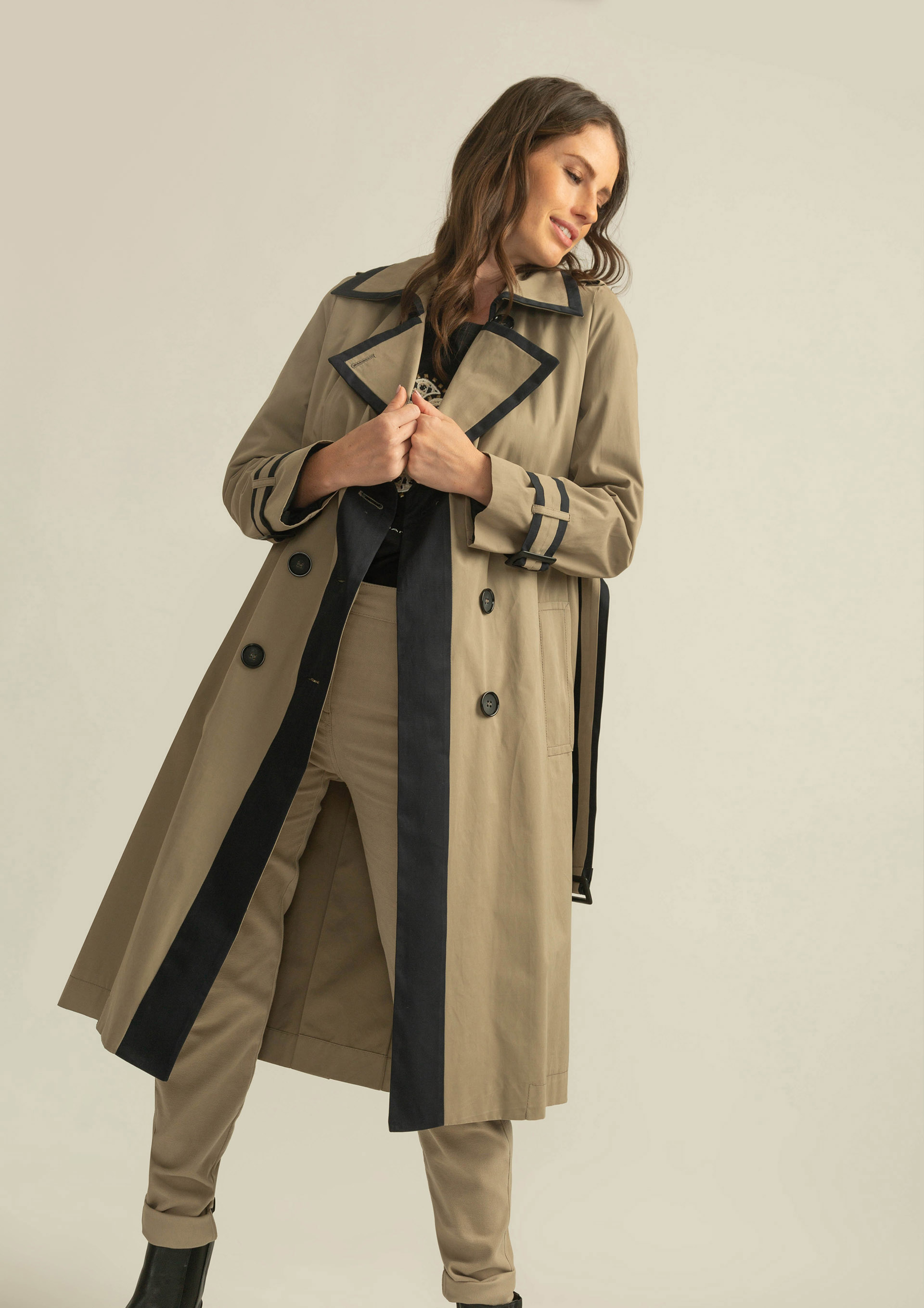 Gabardina larga AC de corte entallado con detalle de acabados a contraste. Este modelo presenta cuello solapa, trabillas en hombros, manga larga con trabillas en puños, bolsillos laterales de vivo, trabillas en cintura y cinturón del tejido con hebilla incluido. Bajo recto con detalle de pliegue central posterior y abertura laterales abotonadas. Cierre principal delantero con doble botonadura. Forro interior.